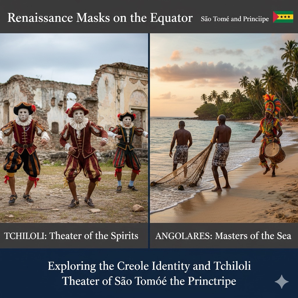 Titled ‘Renaissance Masks on the Equator | São Tomé and Príncipe,’ this visual encapsulates the article’s exploration of ‘the Creole Identity and Tchiloli Theater of São Tomé and Príncipe,’ highlighting the islands’ profound cultural fusion.