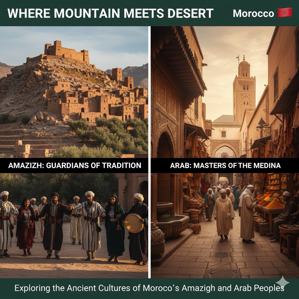This image beautifully contrasts the rich cultural landscapes of Morocco’s Amazigh and Arab peoples. On the left, an Amazigh village, nestled in a mountainous desert, showcases traditional architecture, while Amazigh dancers in traditional attire embody their role as ‘Guardians of Tradition.’ On the right, a bustling Moroccan Medina, with its vibrant markets and iconic minaret, represents the ‘Masters of the Medina’ and the urban heart of Arab culture. Titled ‘Where Mountain Meets Desert | Morocco 🇲🇦,’ this visual narrative captures the blend of ancient traditions and vibrant daily life explored in the article.
